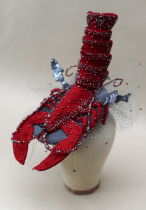 This hat was inspired by Surrealist hats of the 1920s and 30s. The body of the lobster is made from wool felt, strengthened with millinery wire. The body has then been beaded. The leaping fish are made from wool felt sewn with sequins.